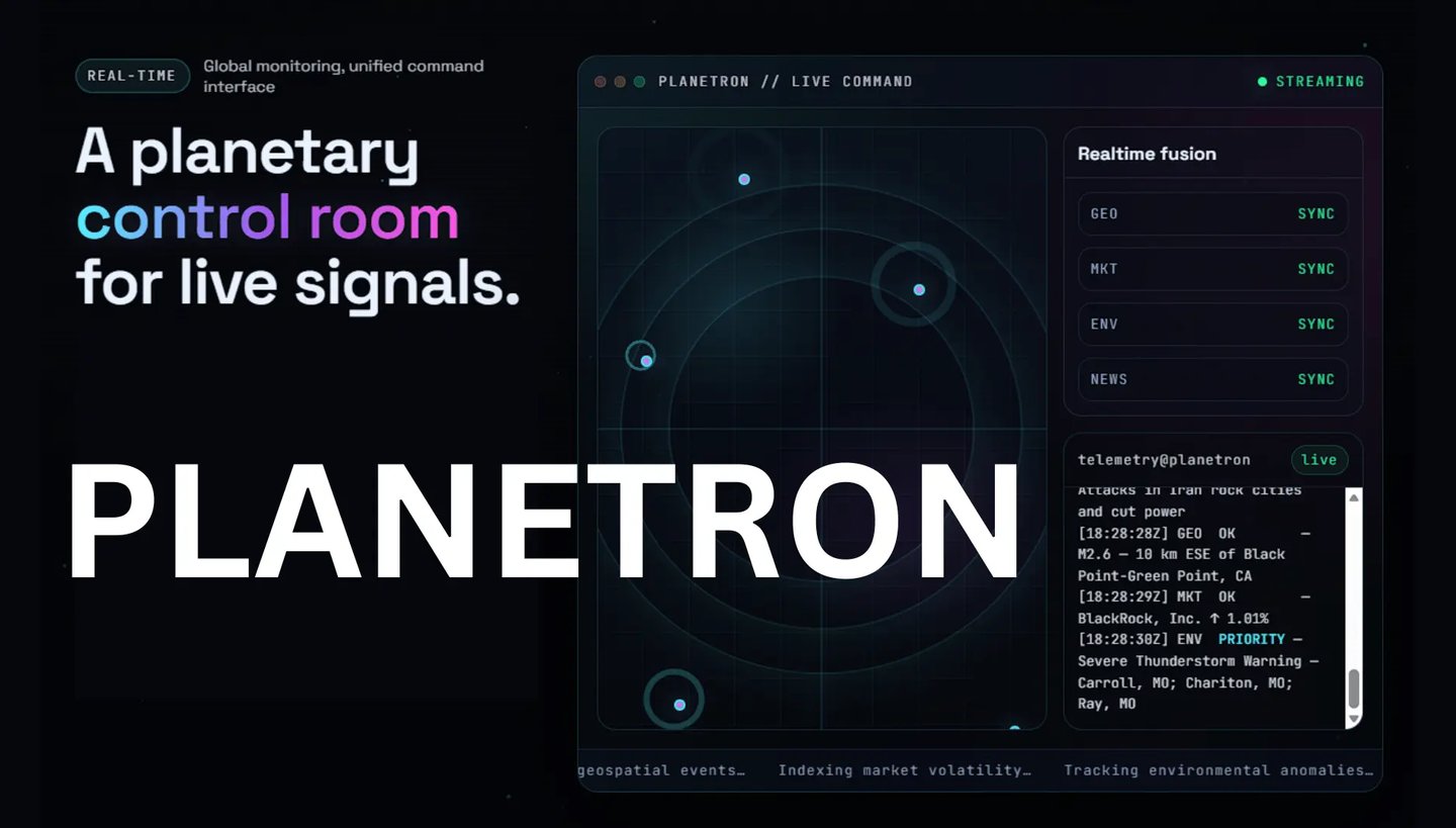 Planetron.io Command Center aggregates geospatial events, financial markets, environmental monitoring, and global news into one interactive map-centric dashboard.